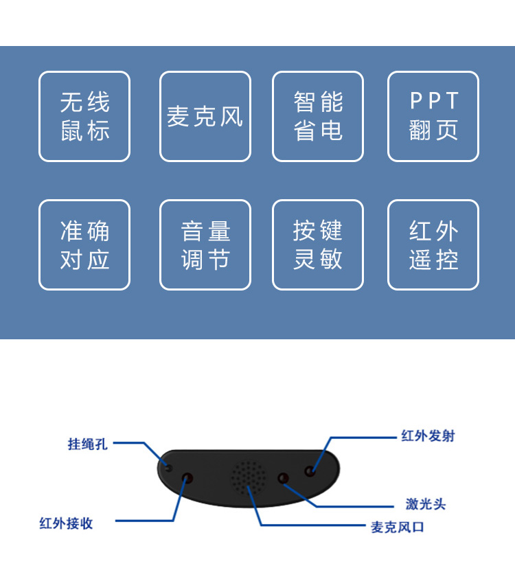 自主研發集遙控器、鼠標、麥克風、翻頁器、激光筆于一體,支持課件翻頁、課堂擴音等課堂操作功能,產品自帶鋰電池,續航時間長達8小時,紅外傳輸距離可達20米。