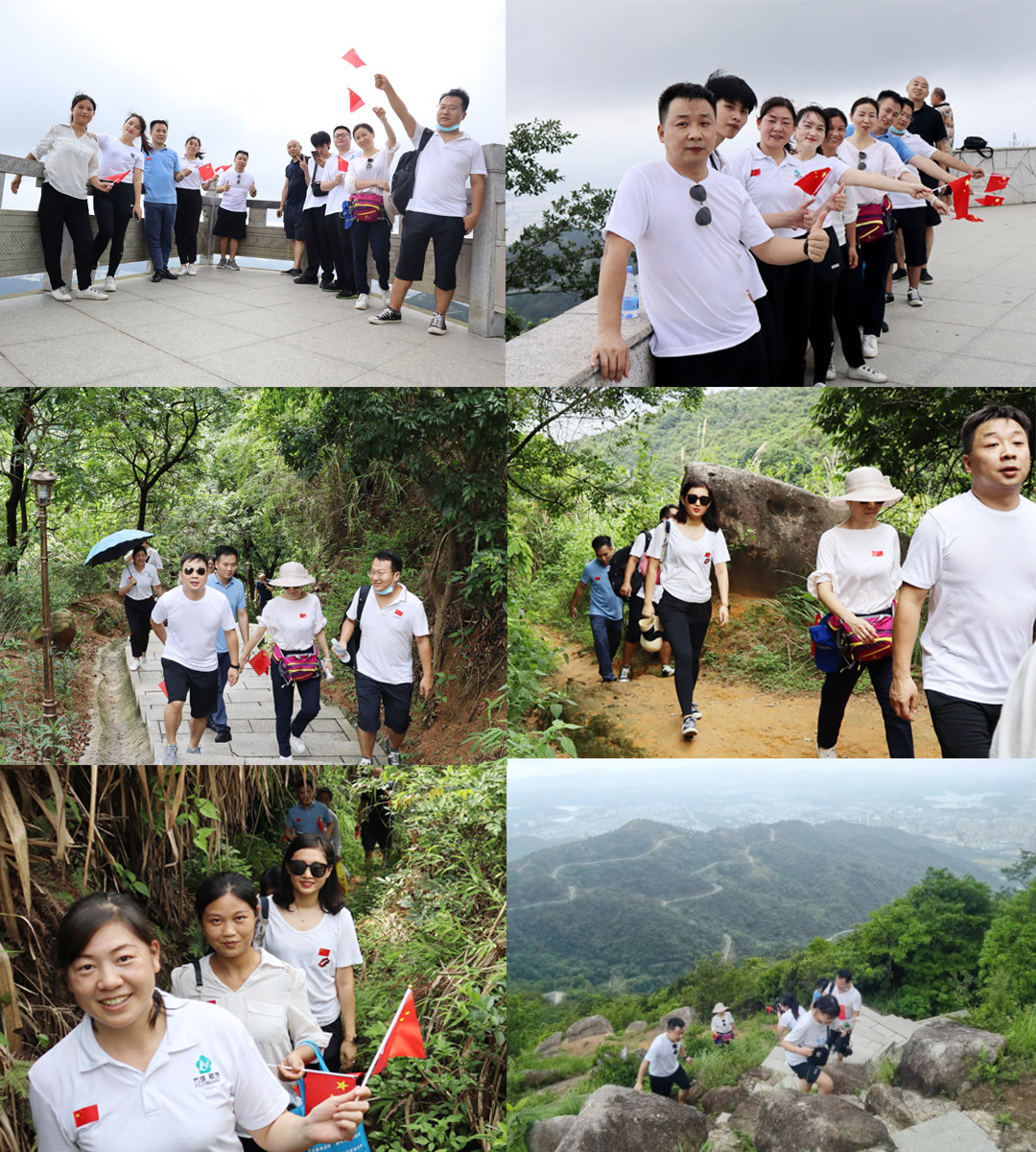 活動當天烈日炎炎,偶爾還伴著淅瀝小雨,但是方成人的登山熱情絲豪不減?;锇閭兙穸稊\,一路克服腳下的困難,互相鼓勵,朝著山頂奮力前進,約1個半小時后到達山頂。一陣陣山風吹來,放眼望去,層林盡染,一覽眾山小,一切美景盡收眼底。