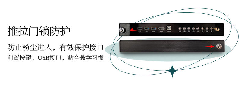機(jī)身保護(hù)——獨(dú)特的推拉門鎖設(shè)計,保護(hù)前置按鍵及接口,還能收納白板筆和教鞭;